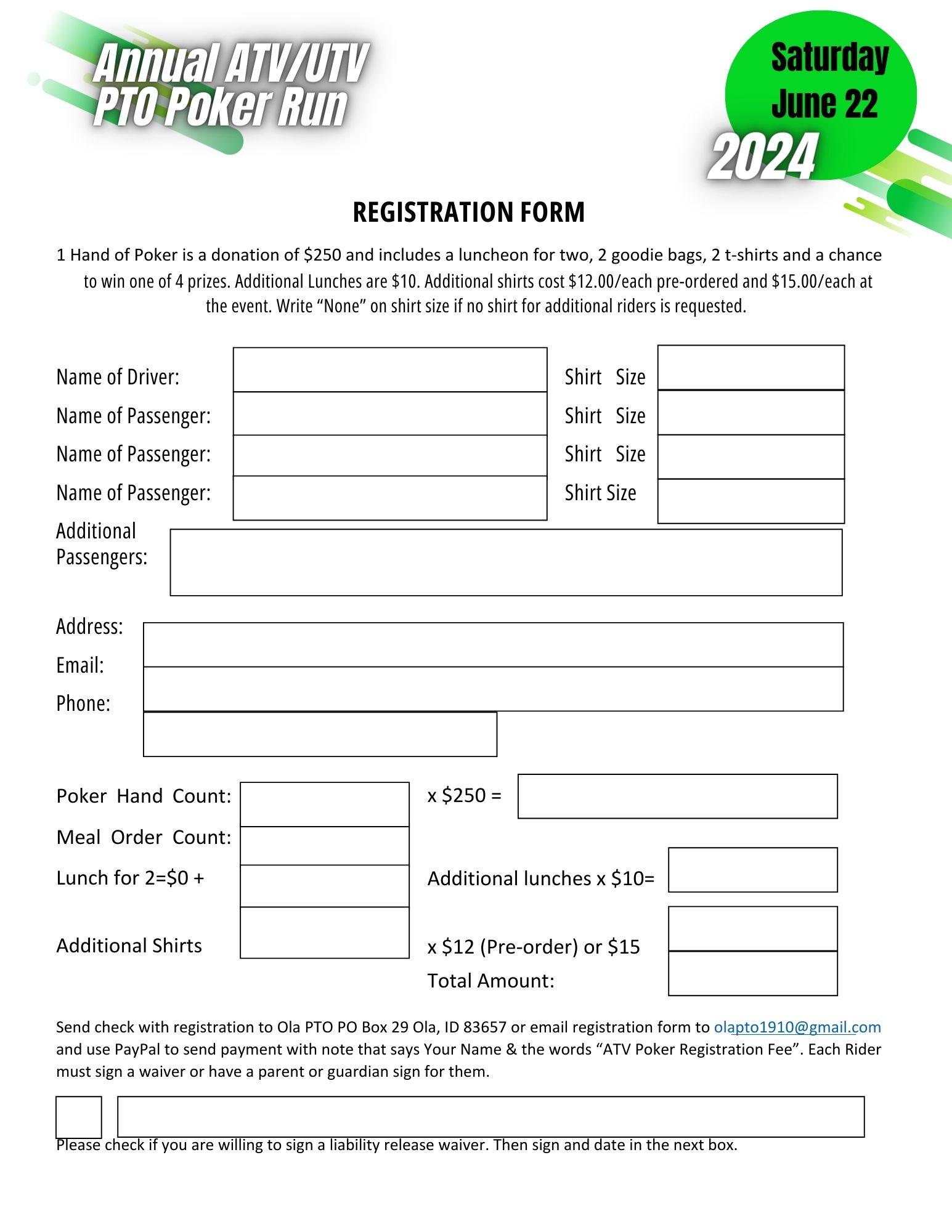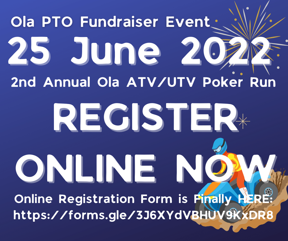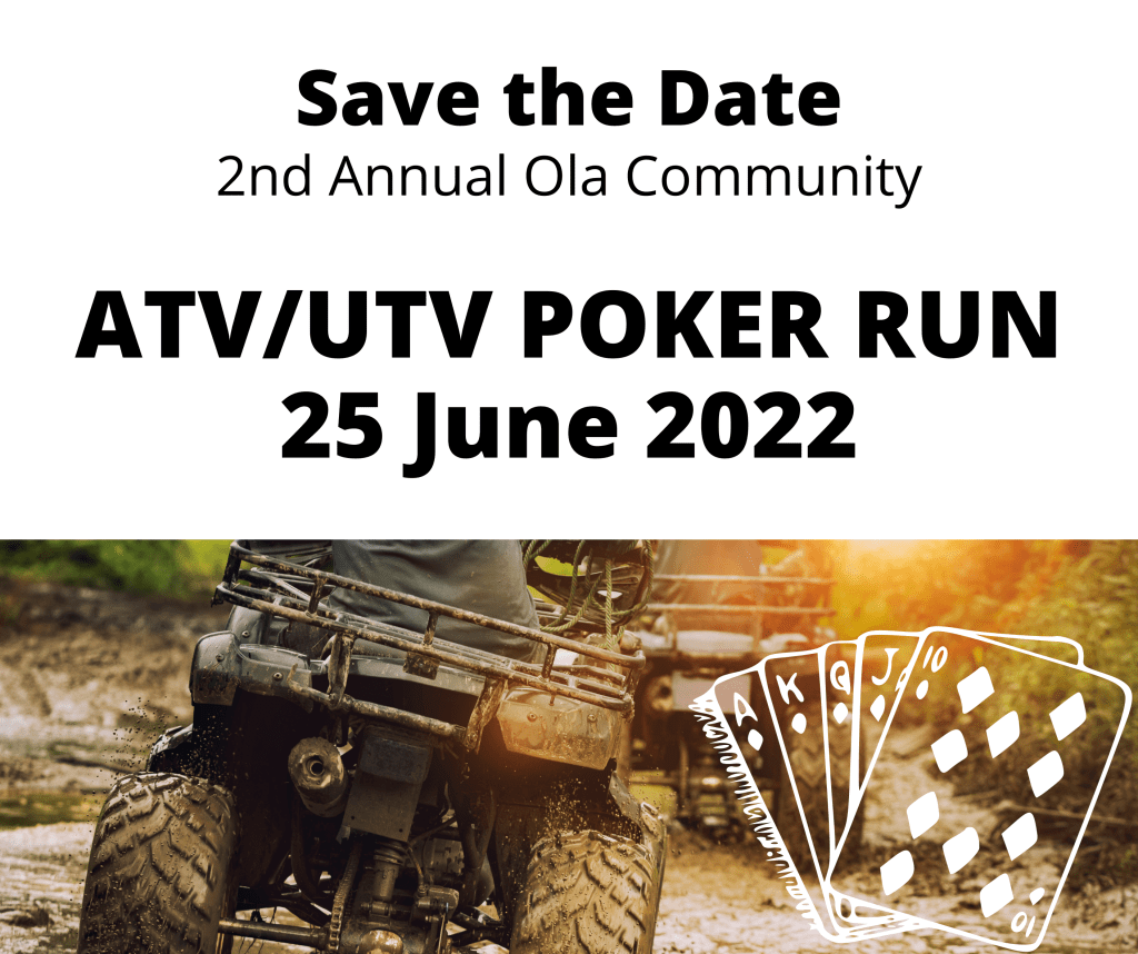 The entire Ola Community is anticipating and excited about their 2nd Annual ATV/UTV Poker Run. With one under our belt and knowledge in our jeans we’re ready to get to work to make this fundraiser event unforgettable.