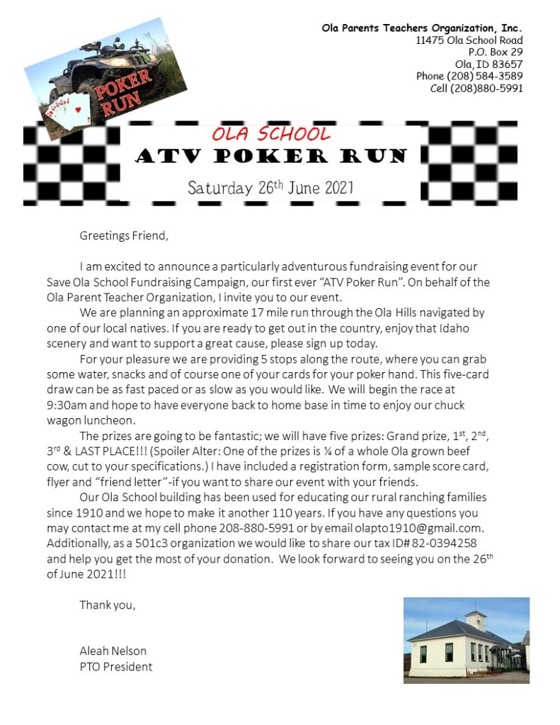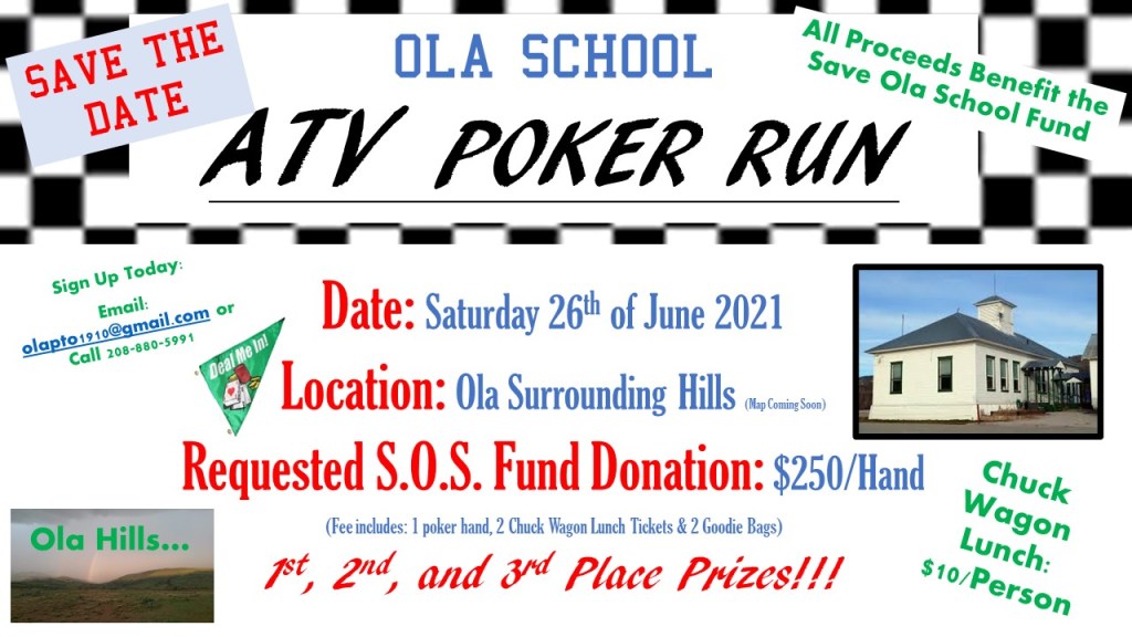 We are so excited to announce another grant win for the Ola School. The Ola Parent Teachers Organization submitted a matching grant with The Idaho Heritage Trust Foundation and we were awarded $12,500. A required match of $12,500 will be coming from the $50,000 Ola School repair fund from the Emmett School District for a total of $25,000. Ola School has a huge support system. Each effort in our behalf has warmed the hearts and watered the eyes of the entire community from. Thank you to all of our supporters and friends of Ola. If you would like to donate please contact Aleah Nelson 208-880-5991.