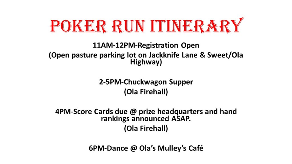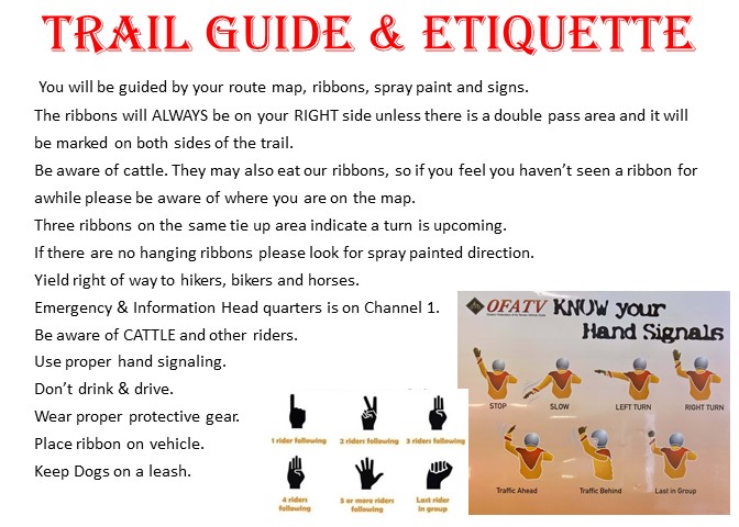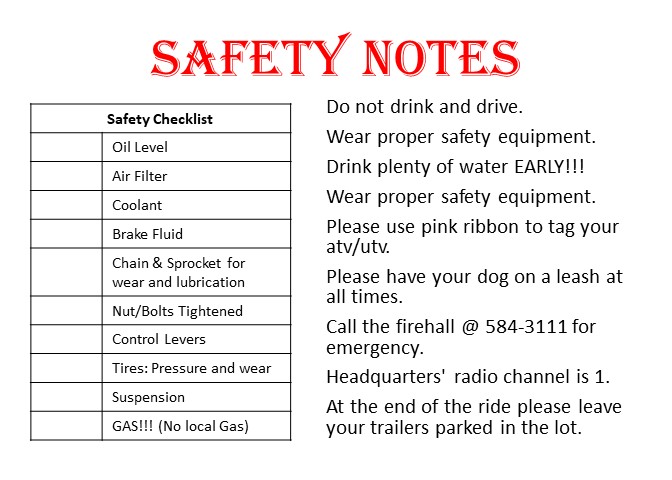 We are so excited to see you all at the poker run. We hope you are ready for a good time!!! Here is the official schedule, safety check lists, score card, and trail guide/etiquette.