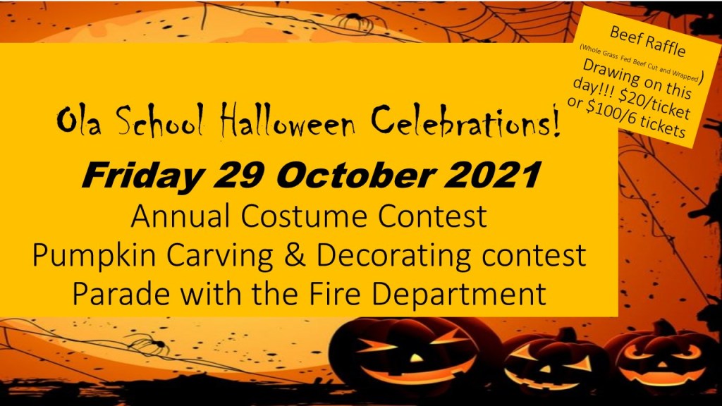 Ola School Re-opening party-bon fire, BBQ potluck, fireworks, and ribbon cutting party to be help for re- opening.