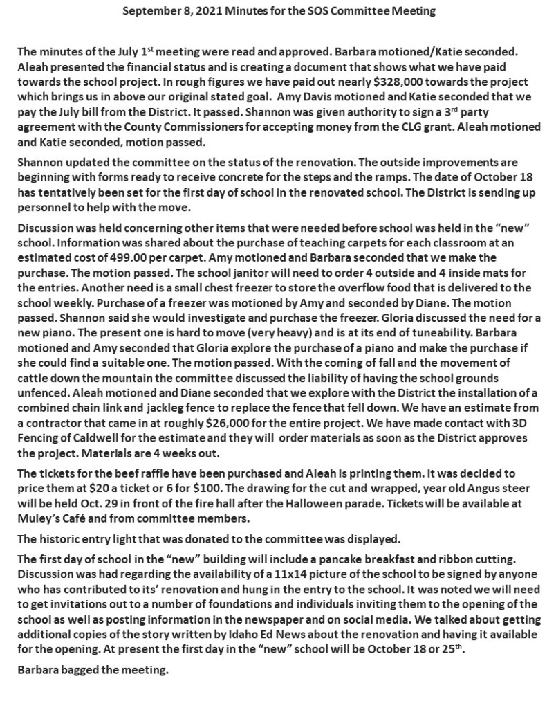 The minutes were read and Gloria motioned and Aleah seconded to approve as written. Motion passed. •Aleah reported on the financial status of the SOS account, see attached sheet for details. Note that our two most recent grants, Heritage Foundation and the Preservation CLG grant and the Harry W Morrison grants are not reflected in the total, with them you would add $42,500 to the total. Also note that we have had some expenditures for work completed by Trout Architects, and Atlas Co. for asbestos and lead paint testing. Aleah has set up several tracking forms to keep track of incoming and outgoing funds. •Grant progress report was made by Aleah and Shannon. The letter of inquiry was completed for the Murdock Foundation grant and sent in earlier this week. We are looking at the application for an AARP grant that needs to go in before the middle of April. They also reported that the interim report to the Laura Moore Cunningham Foundation Grant had been completed and sent to them this week. Forms were handed out and explained for the recording of in-kind labor for all the work committee members are doing. The conversion for Idaho from hours to equivalent dollars in set at $25 per hour. Travel is to be recorded at .14 per mile. If you need a recording sheet let us know. •Shannon gave an update of the renovation work since we last met. The classrooms were readied for the demolition crew to begin work on March 8. Since that date the east classroom interior walls and ceiling have been removed as well as the floor 18” inside the walls. Presently you can see from the outside to the inside through the bottom 20 some inches of the walls. The west classroom is still having lead paint removed and lathe and plaster as well. Work will begin soon to excavate the crawl space for a new stem wall that will help support the present foundation. •The next topic of discussion was the ATV Poker Run. Katie and Aleah reported on the planning that has already taken place. Katie has identified the route the course will take, figured out where stations will be located and secured a number of helpers for that day. She also discussed ideas for a silent auction and prizes that have already been secured. Aleah shared the posters that she has developed to advertize the event and a number of individuals took some with them to post. Aleah also gave the good news that we have sponsors for the event, the new Gem County Motor Sports business in Emmett, also sponsoring is the Cowboy Chophouse. Liability insurance will be about $200 for the event through the “Ride it out, LLC”. They will also provide some large prizes and $500 to support the event. Katie reported that she has secured a quarter of a beef, a handcrafted knife and some leather goods. Aleah said that BSU will provide small items for the goodie bags. Aleah will be working with Shelly to decide on goodie bags and shirts for the event. •The next item for discussion was advertizing. We are planning the see if we could set up a table at the Farmer’s Market in Emmett and perhaps tables at other businesses such as D&B, Tractor Supply, BiMart, ZamZows and others to sign folks up for the event. We need volunteers to do this for us. Let Aleah know. I am attaching a copy of the online letter you can send on to your contact list about the event. Please make use of it. •Discussion was had about the possible use of the fire hall for the event headquarters, silent auction and lunch. Aleah is making contact with the new owners of the café to see how they would like to be involved. Shannon said she would contact EMS about having an ambulance on standby for the event. •Meeting was bagged by Katie. •